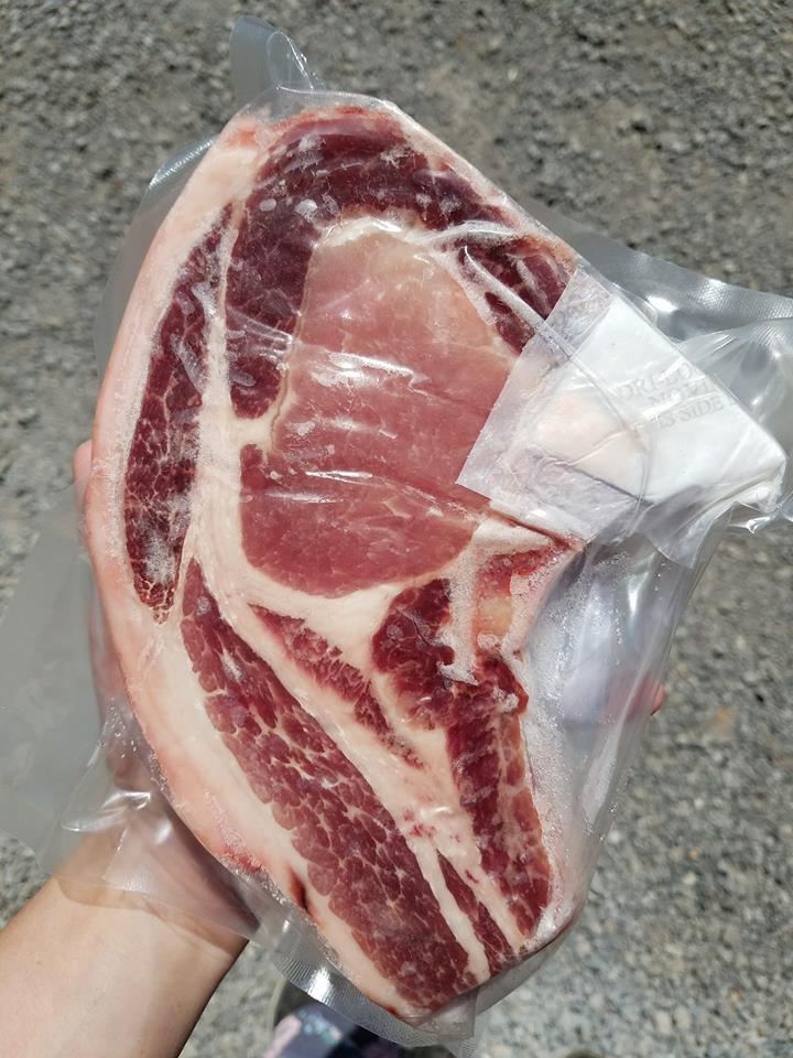 These pork chops are from our pasture raised pigs. They are fed a supplemental feed that is non gmo. They are also fed any extra raw milk or eggs we have. The land they forage is free of any pesticides or chemicals. They are 2 per pack and are 3/4 in. thick.